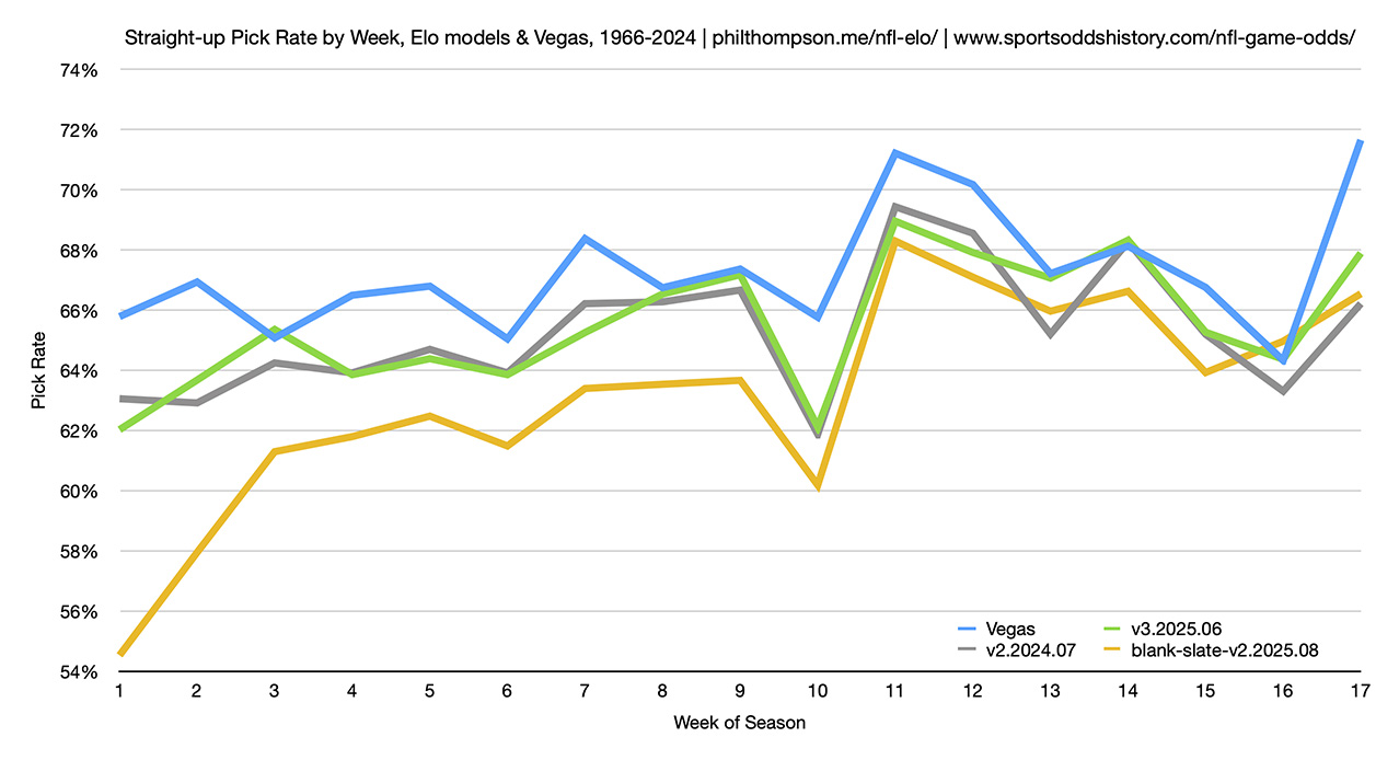 For some background, I calculate week-by-week Elo ratings for each team based on only a few data points including game score, game venue (home/away/neutral field), rest days, etc. Based on team Elo ratings and those factors, my models are used to calculate each team's expected performance in the next game. After each game, team Elo ratings are updated based on actual vs. expected team performance. My theory is that only a few data points are needed to produce decent Elo ratings (no advanced metrics or stats of any kind) and I compare my models' pick rates (percentage of game winners correctly picked) against Vegas's straight up pick rates as a benchmark.