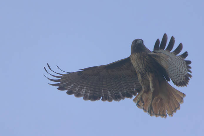 I took advantage of a non-rainy morning to go birding. The fog rolled in just as I set out, so, with the softer light due to the fog, I decided to head to a woodsy location. I enjoyed watching a handful of very active Acorn Woodpeckers but didn't come away with any keeper shots. I did finally get my first Red-tailed Hawk photos with my camera, though it flew away before I got the chance to dial in my camera settings.