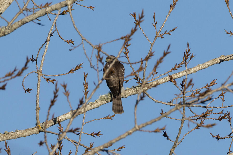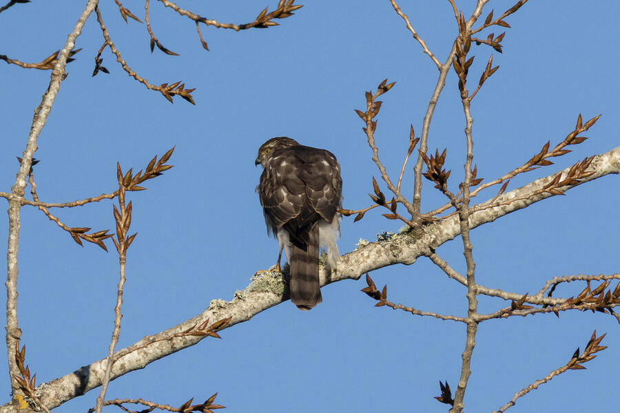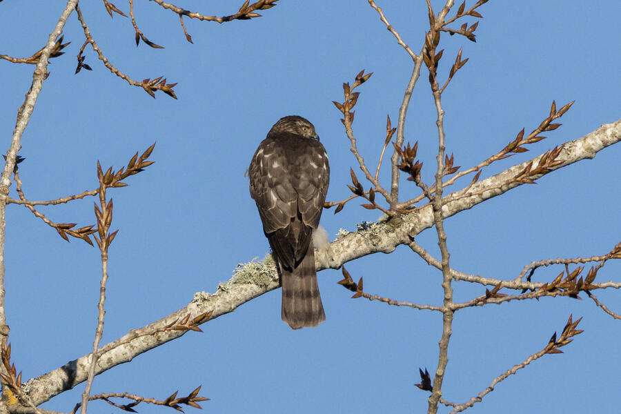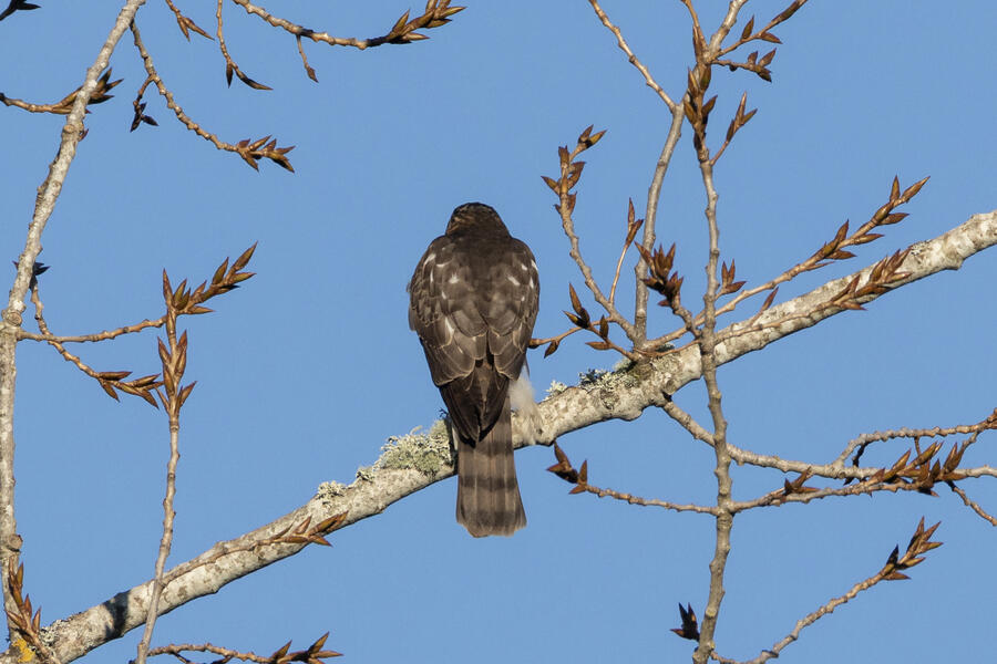 Sharp-shinned HawkThis hawk was super tiny (about the size of a Jay), so that's the main field "mark" I'm using to distinguish it from Cooper's Hawk. The tail also ends with a pale brown band, not a dark band or dark band with white edge. The legs are certainly skinny and the eye doesn't have the fierce brow appearance of a Cooper's.