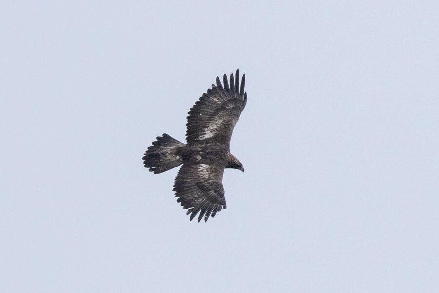 Golden EagleCompared to a soaring Bald Eagle, a Golden Eagle appears to be slightly smaller-headed and longer-tailed.
