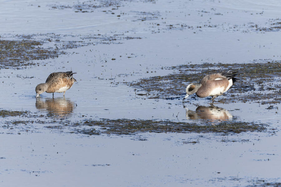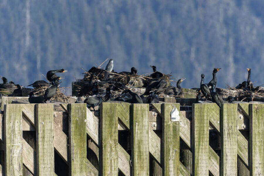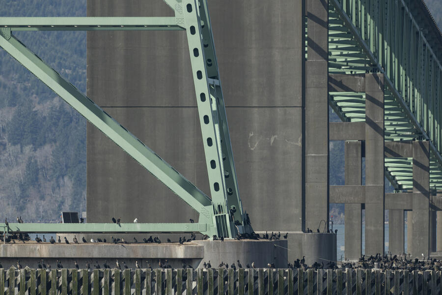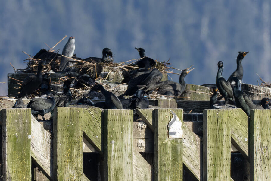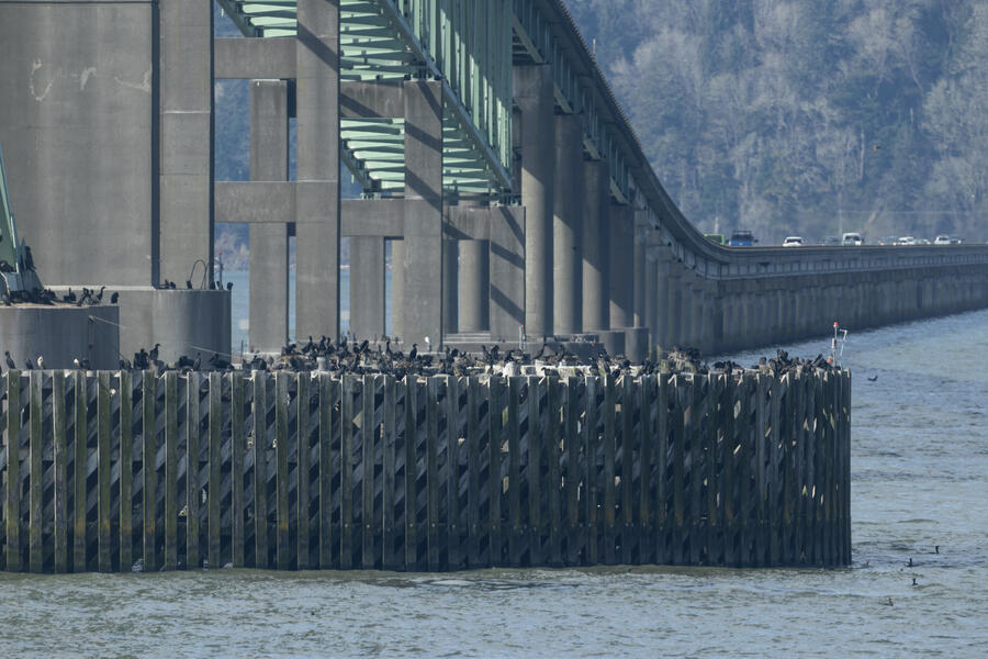Double-crested Cormorant, Brandt's CormorantAs far as I could tell, of the hundreds of cormorants sitting and nesting on the bridge piers, just about all were Double-crested Cormorants and these couple dozen were Brandt's Cormorants. There's a plastic dummy falcon there, an ineffictive one I'd say, as well.